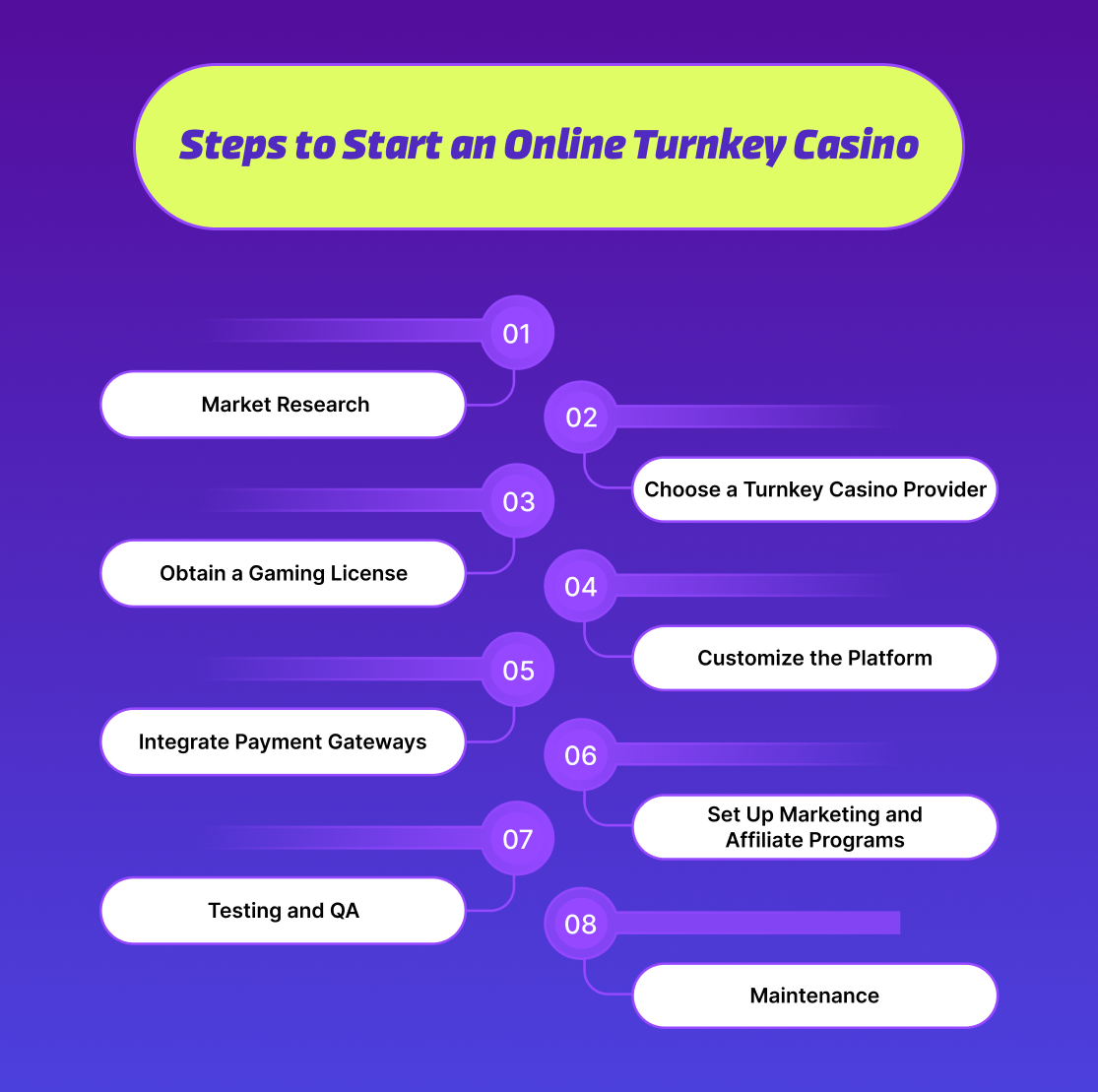 As per the latest turnkey online casino startup guide 2026, starting an online turnkey casino business takes a lot of effort and planning. Here is the list of the steps that you must follow as an operator to launch a successful turnkey casino efficiently and cost-effectively:
